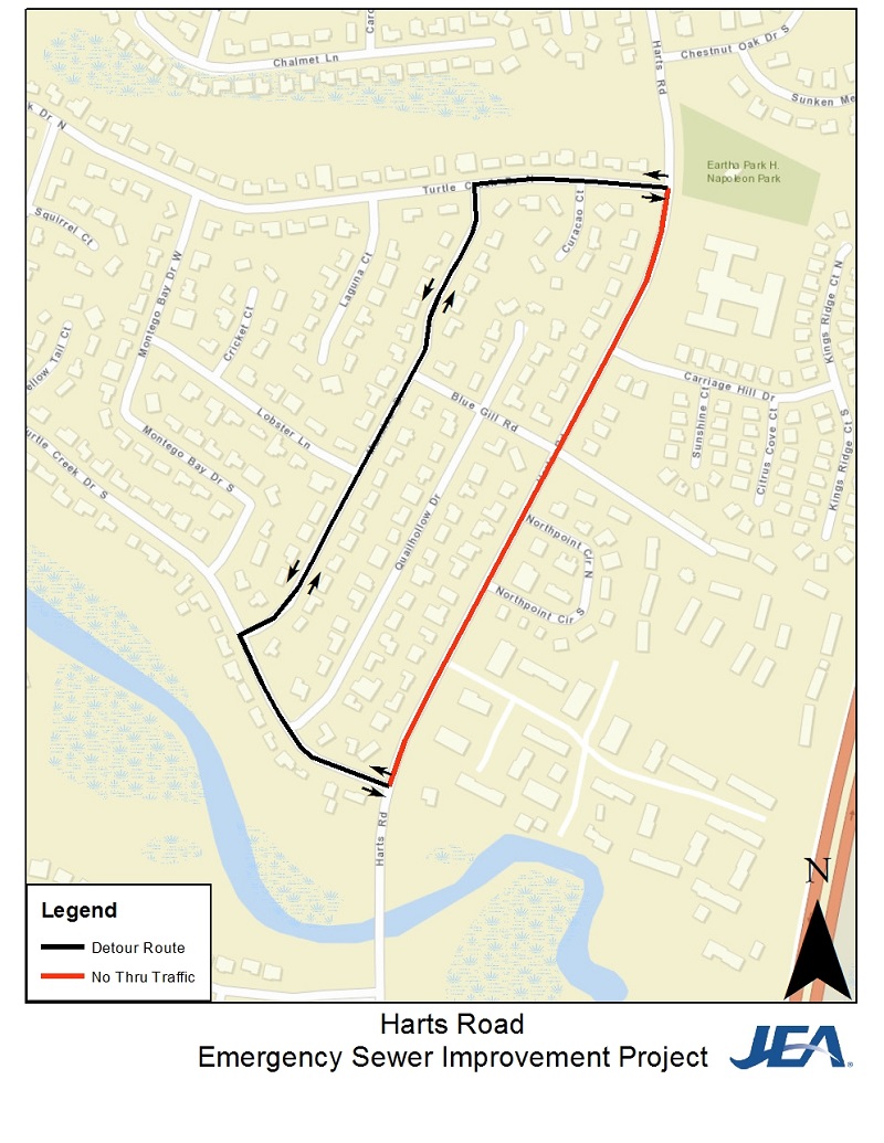 JEA crews will be repairing a portion of failing sanitary sewer line on Harts Road between Turtle Creek Drive North and Blue Gill Road.